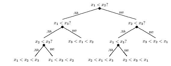 Na slici gore prikazano je sortiranje pomocu stabla odlučivanja za n = 3. Vremenska složenost (u najgorem slučaju) algoritma definisanog stablom T jednaka je visini stabla T, odnosno najvecem mogucem broju pitanja koja treba postaviti za neki ulaz. Stablo odlučivanja prema tome odgovara algoritmu.