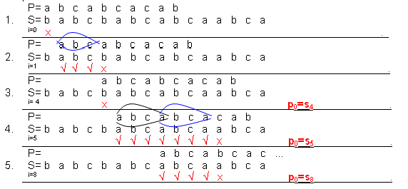 U narednom koraku (i=5) imamo sravnjeni deo dužine 7. Sada se analizira da li u njemu ima neki deo koji odgovara početku ili kraju obrasca. Pošto postoji određeno slaganje, u sledećem koraku se obrazac pomera za 4 pozicije.