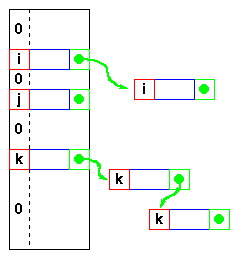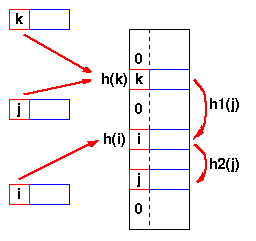 ![]() h(j)=h(k), pa se koristi sledeca hash funkcija h1. Nastaje i drugi sudar, pa se koristi sledeca hash funkcija h2. |
