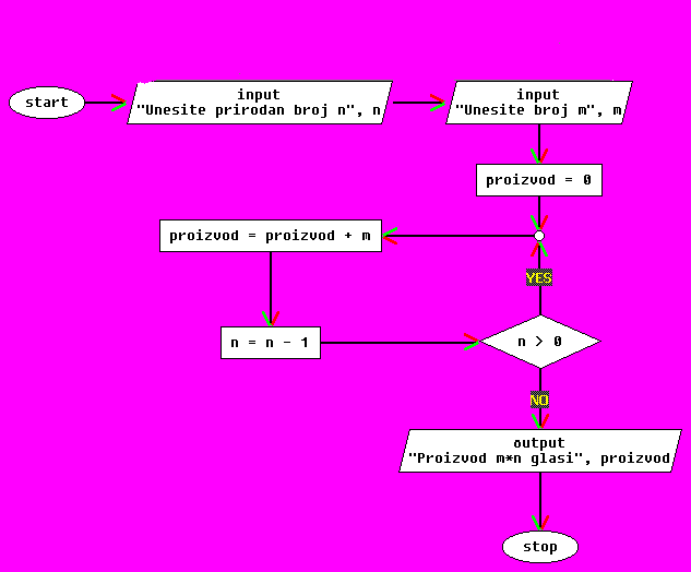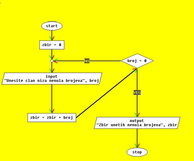 U ovom algoritmu (blok-shemi) se može uočiti linija toka koja povezuje simbol uslovnog grananja i šemu dela programa koji se izvršava u slučaju istinitosti testiranog uslova ( na shemi označen sa YES ).
