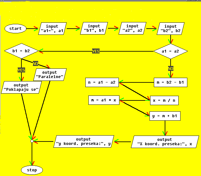 Formirati/opisati algoritam koji za učitane koeficijente jednacina dve prave (oblika: y = ax + b) ispisuje na izlaz njihov presek ili odgovarajucu poruku ako su prave paralelne ili se poklapaju.