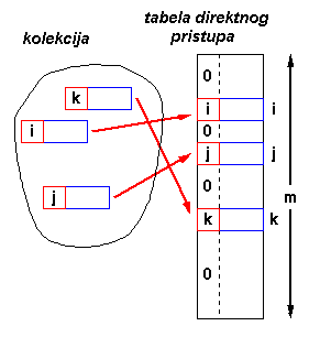 elementi mogu smestiti u tabelu sa direktnim adresiranjem T[m],