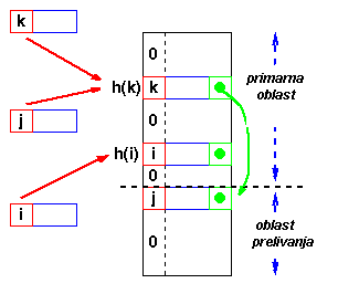 Ovaj princip deli pre-alociranu tabelu u dve oblasti: primarnu oblast u koju se preslikavaju kljucevi i oblast za sudare, koja se obicno zove oblast prelivanja.