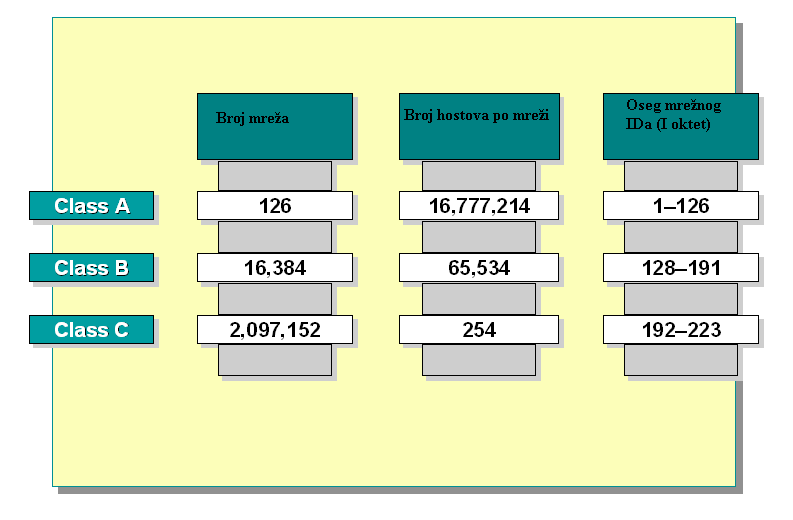 Kod ove klase prvi bajt adrese predstavlja mrežu, a preostala tri bajta host računar.